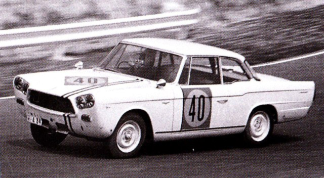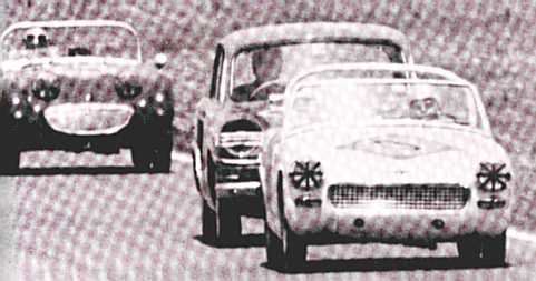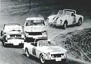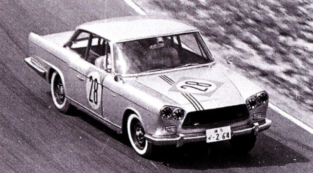 なにも準備していないプリンスがウルトラQで有名な高価なスカイライン・スポーツを2台、生沢徹とR・ジョーンズに。先に述べた田原源一郎がツインキャブ改造フェアレディSR310(1.5リットルG型)を1台。セドリック1900DXが1台、R・ダンハムは個人。あとは外車で、トライアンフのTR-4が3台、矢島博とジャズピアニストで作曲家の三保敬太郎(年寄りに「深夜TV、イレブンPMのテーマ教えて」と訊ねると、三保の有名な「シャバダバ」歌いだすぞ)ともう1人。もちろん三保はジャズ好き式場の友人でボンボン。TR-3(古い)5台。立原義次がトリプルエントリー。個人の車だろう。もっと古いTR-2も1台いるぞ。MGBが1台に古いMGAが3台もいる。ポルシェもいる。1500か1600だ。356AかB。OSCAのDOHCと積んだフィアットもいる。