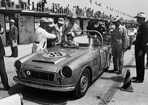 なんとフェラーリを持ってきたのはフランス人のピエール・デュメイだ。一応、国際レースには出ているがワークスではない。雇われチームでもなく、個人で買ってレースエントリーのお金持ちだろう。ツール・ド・フランスレースのGTクラスの上位レベル。誤字の多い資料本では奥方が美人で熱々だそうな。当時の日本人は白人女性コンプレックス高かったろうなぁ。また、フェラーリというのも、日本人は海外レースは知らないし、市販車は庶民にはなじみが無さ過ぎてまだ知名度が無いんだ。アメリカやイギリスに詳しくてもイタリアの知名度低そうだし。250GTベルリナッタはTDFではなく、速いが操縦の難しいSWBらしい。
