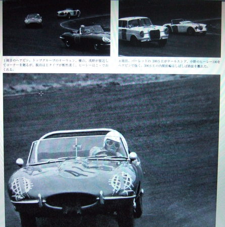 ヒーレー3000の27歳、浅野正雄は事前練習も熱心だったが、レース本番で現130R(当時150R)でクラッシュし意識不明の重態、半年後死亡した。横山はこの後プリンスワークスで生沢と共に。しかし、オーウェン以外でもこんなにジャガーEタイプをサーキットで走らせるボンボンがいたんだなぁ。